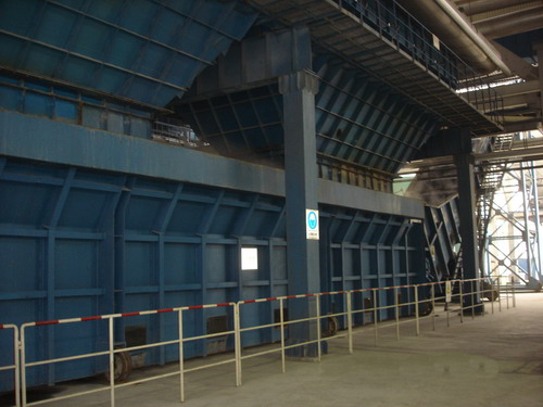 渣井布置在鍋爐下連箱下方,其主要功能是事故性儲(chǔ)渣和吸收鍋爐水冷壁的膨脹量。通常情況下,渣井具有不小于機(jī)組在MCR工況下4小時(shí)排渣的貯存容積,渣井支承方式通常采用獨(dú)立支撐式,當(dāng)采用獨(dú)立支撐式時(shí),應(yīng)為下部撈渣機(jī)能橫向拉出檢修留有足夠的位置;渣井水封槽能有效地吸收鍋爐水冷壁垂直和水平方向的膨脹量,且水封槽中設(shè)有沖洗排污措施。當(dāng)采用懸吊式安裝時(shí),不設(shè)水封槽,但鍋爐的膨脹量由下部設(shè)備吸收。